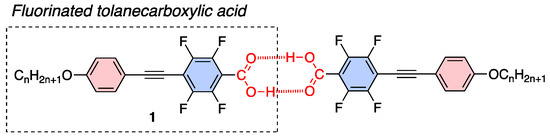 Arakawa et al. reported that aromatic carboxylic acids, including tolanecarboxylic acid, show broad LC behavior due to formation of dimer via hydrogen bonds [15,16]. Wen et al. examined fluorinated LC molecules and reported that fluorinated tolanes with an ester structure [17] or fluorinated biphenyls with a carboxy unit exhibit LC behavior [18]. Based on the molecular design of hydrogen-bonded dimer-type LC molecules, we focused on the hydrogen-bonded dimer-type LC molecules of carboxylic acid. In this study, we designed and synthesized a series of fluorinated tolanecarboxylic acids 1, such as 2,3,5,6-tetrafluoro-4-[2-(4-alkoxyphenyl)ethyn-1-yl]benzoic acids (Figure 2), and evaluated their LC and PL characteristics in detail.