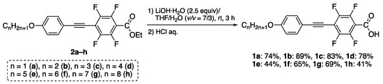 Treatment of ester 2a with 2.5 equivalent of LiOH·H2O in a mixed solvent of THF and H2O (v/v = 7/3) at room temperature for 3 h underwent a hydrolysis reaction, which proceeded smoothly. Subsequently, treatment with an aqueous solution of concentrated HCl produced corresponding fluorinated tolanecarboxylic acid 1a. The product was purified by column chromatography and recrystallization, and the resulting 1a was generated as a white solid in a 74% isolated yield. Using a similar synthetic procedure, other analogs 1b–h bearing various alkoxy chains were also produced in 41–89% isolated yields. The molecular structures of 1a–h were assessed by 1H, 13C, and 19F-NMR, along with IR and HRMS. All structures were completely identified and sufficiently pure to evaluate their phase transition and photophysical behaviors.