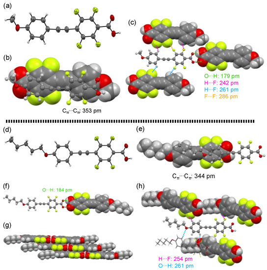 In contrast, pentyloxy-substituted 1e furnished single crystals with a monoclinic system in the C 2/c space group, and eight molecular units were contained in the Cry lattice. The electron-rich aromatic ring and the electron-deficient fluorinated aromatic ring were nearly coplanar, with a deviation of 3.0°. The dihedral angle between the fluorinated aromatic ring and the carbonyl plane was 11°, being almost coplanar (Figure 4d). However, unlike the π–π stacking of the antiparallel orientation in 1a, 1e formed a slipped π–π stacking (short contact of Cπ⋯Cπ: 344 pm) with a synparallel orientation induced by the electrostatic interaction between the electron-rich pentyloxy aromatic ring and the electron-deficient fluorinated aromatic ring (Figure 4e). As shown in Figure 4f,g, the carboxyl units in 1e also formed an intermolecular O⋯H hydrogen bond with a short contact of 184 pm, leading to formation of layer structures. For construction of the crystal structure of 1e, more intermolecular interactions, such as additional O⋯H and H⋯F hydrogen bonds (Figure 4h), were also observed. The interatomic distance was 254 and 261 pm for O⋯H and H⋯F, respectively, which was also almost identical or below the sum of van der Waals radii [25].