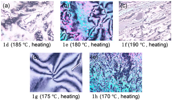 Optical microphotographs of (a) 1d, (b) 1e, (c) 1f, (d) 1g, and (e) 1h in the mesophase phase.