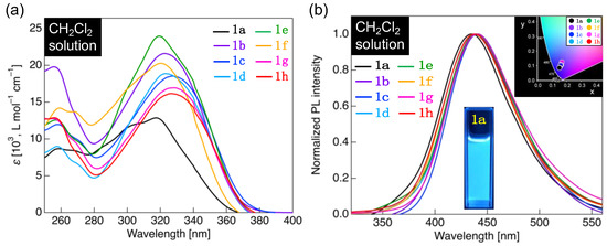 (a) Ultraviolet (UV)–visible absorption spectrum of 1a–h in the CH2Cl2 solution (concentration: 1.0 × 10−5 mol L−1). (b) PL spectrum of 1a–h in the CH2Cl2 solution (concentration: 1.0 × 10−5 mol L−1) and a photograph of the PL behavior of 1a solution under UV light (λex = 365 nm). Inset: Commission Internationale de l’Eclairage (CIE) diagram for PL color of 1a–h solutions.