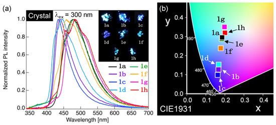 (a) PL spectra of 1a–h in crystalline state. Excitation wavelength (λex): 300 nm. Inset: Photographs of the PL behavior of the 1a–h crystals under UV light (λex = 365 nm). (b) CIE color diagram of PL colors for 1a–h crystals.