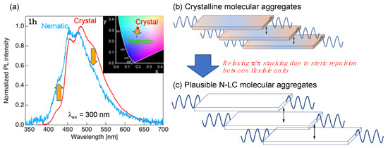 The PL spectrum of 1h with N-phase aggregated structures was also obtained by irradiation with incident light of 300 nm, in which the λPL was approximately 454 and 479 nm, along with a shoulder peak of approximately 428 nm. Compared to the Cry phase, the PL spectra of the N-phase aggregated structure yielded a slight short-wavelength shift with weakened long-wavelength shoulder peaks and increased short-wavelength peaks. In the Cry phase, the dimer mesogens formed a dense packing structure due to the weak π⋯π interactions (Figure 8b), as shown in Figure 4g. Conversely, the phase transition to the N-phase increased the molecular fluidity, allowing the increase in the two molecular distances (Figure 8c). The increased spacing between the dimer mesogens in the N-phase aggregated structure and the promotion of the molecular motion drastically reduced the ΦPL compared to that in the Cry phase.