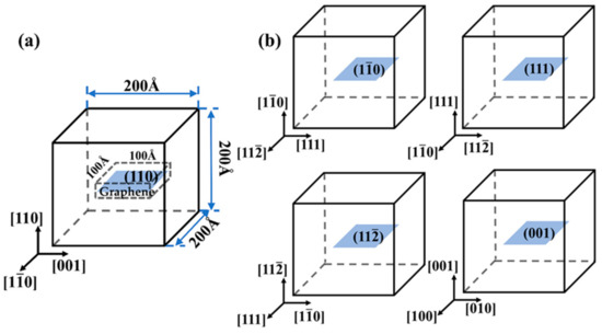 Schematic of molecular dynamic (MD) setting for the graphene nanosheet embedded into iron aligned along different crystallographic plane in the Gr/Fe composites: (a) (110) and (b) other four plane of (), (111), () and (001), respectively.