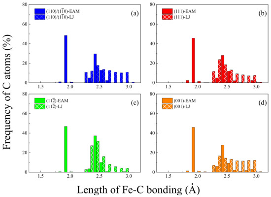 Distribution histograms of the length of Fe-C bonding (L) at the Gr/Fe (a) (110) or (), (b) (111), (c) (), and (d) (001) interface, respectively, calculated from MD simulations using LJ and EAM potentials.