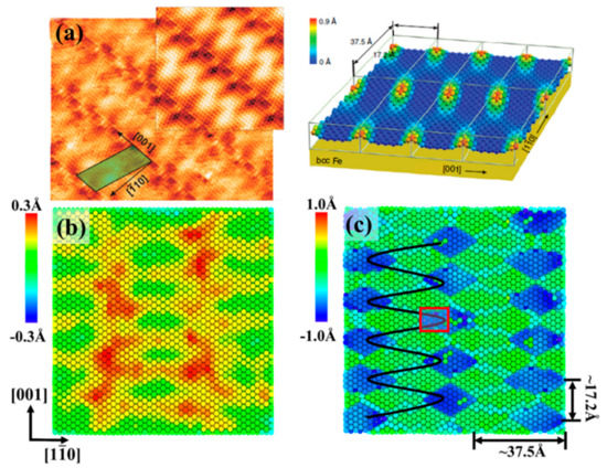 In Figure 3c, a diamond-shaped moiré pattern presented by the displacement of Fe atom is characterized by 35 × 17 Å2 corrugation structure, in which every 18 graphene rings match 19 columns of Fe atoms (−35 Å) in the zigzag direction (i.e., the [] direction) and 6 graphene rings match 7 Fe–Fe distances (−17 Å) in the armchair direction (i.e., the [001] direction), in consistent with the pattern in Figure 3a. The lattice compatibility of graphene and Fe matrix is the main factor to dominate the periodicity of this pattern.
