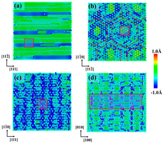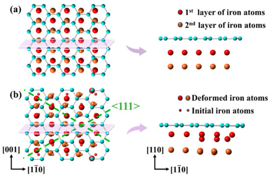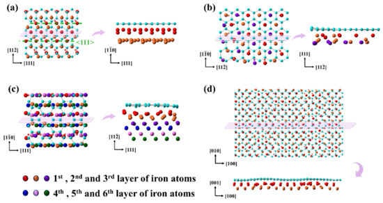 Moreover, atomic structure characteristics in the red regions of Figure 5 are further analyzed in detail, as shown in Figure 6. The 1st–6th layer Fe atoms are marked with the color of red, orange, purple, blue, pink, and green, respectively.