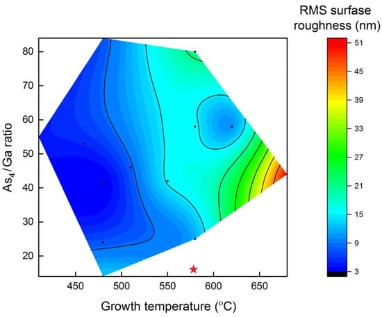 Root mean square roughness vs. growth temperature and As4/Ga ratio (black dots are experimental measurements, out-of-order sample #87 with hole conductivity and with extra-large surface roughness 117 nm is marked by asterisk outside the interpolation area).