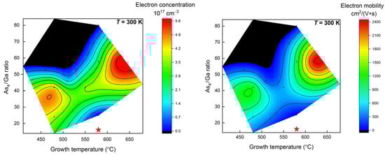 Electron concentration and mobility vs. growth temperature and As4/Ga ratio (black dots are experimental measurements, values of n and μ are conventionally considered zero for non-measurable samples with too low conductivity, out-of-order sample #87 with hole conductivity is marked by asterisk outside the interpolation area).