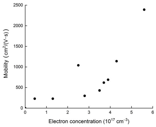 The experimental data are visualized in form of a 3D color map surface with the help of interpolation based on the TPS algorithm. Figure 4 demonstrates the variation of carrier concentration and mobility in the whole range of used growth conditions. The interpolation reveals the probable existence of two areas of growth conditions where increased values of the concentration and mobility of electrons are achieved: the first area is Tg = 450–500 °C and γ = 20–40, the second one is Tg = 600–680 °C and γ = 40–70. An increase in the optimum arsenic pressure for efficient electron doping is also observed with increasing temperature. Note that there is a correlation between electron concentration and electron mobility: on average, the higher values of the electron concentration correspond to the higher values of their mobility, and vice versa (Figure 5). Since the concentration of doping Si atoms is the same in all samples, the observed effect indicates different concentrations of compensating and scattering centers in the samples. Note that the growth conditions from the first optimal area (Tg = 450–500 °C and γ = 20–40) make it possible to obtain films with a smoother surface.