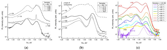 Sample #87 with p-type conductivity demonstrates PL spectrum is radically different in shape from the PL spectra of other samples: the prevailing band lies at 1.48 eV, whereas the high energy band manifests itself as a clearly pronounced shoulder at 1.505 eV. In the case of the (n11)A orientation, the feature observed at 1.48 eV is commonly attributed to the transitions of electrons from the conduction band to the SiAs level and to the SiGa–SiAs transitions [27,36]. We also can conceive that the 1.48 eV PL peak in sample #87 is defined by the transitions from the conduction band to the SiAs levels and by SiGa–SiAs transitions.