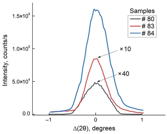 Experimental GID curves of (004) reflection for samples #80, #83, #84. For clarity, the intensities of peaks #83 and #80 are multiplied by 10 and 40, respectively.
