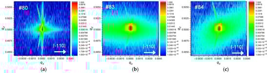 Diffuse scattering in samples #83, #84 is approximately the same in magnitude and significantly exceeds the scattering in sample #80. In this case, the shape of scattering in samples #83, #84 also differs from each other. In sample #83 (Figure 9b) the diffuse scattering “halo” is elongated horizontally, along the qx axis (along the crystallographic direction [10]). In sample #84 (Figure 9c) the distribution of the intensity of diffuse scattering has the shape of an ellipse located with the larger axis along a straight line making an angle of about 20–30° with the direction of the qx axis.