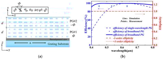 Structure and properties of broadband PG: (a) LC director view of broadband PG with two chiral layers; (b) diffraction efficiency and ellipticity of broadband PG in visible range.