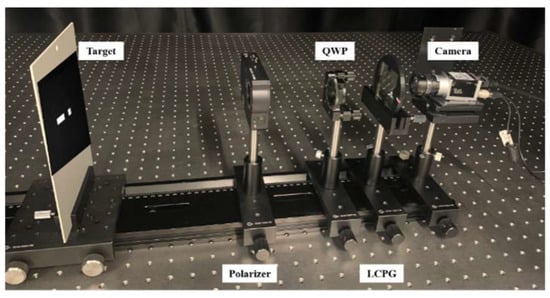 Polarimetric imaging, which can measure the state of polarization (SOP) of two-dimensional (2D) scenes, yields comparable performance to that of classical intensity imaging [,,]. Recently, there is a wide variety of applications for imaging polarimeters, including remote sensing [,,], sky navigation [,,], and biomedical detection [,]. Thus, the development of polarization imaging technology for the acquisition of the polarization characteristics of detected targets is currently a hot topic in optical sensing. Generally, a polarimeter uses a polarizer or wave plate to decode the polarization parameters from the intensity values of the light field [,]. To overcome the bulky volume or mechanical instability of traditional structures, there are various schematics of imaging polarimeters for different applications using complex polarization elements such as scattering materials [], micro-polarizer array [], Savart plates [], liquid crystal modulators [,], gradient refractive index (GRIN) lens [], etc. Among these, high-quality polarization grating (PG) with strong polarization sensitivity and low incoherent scattering is a promising candidate. Techniques using polarized diffraction grating as a method of polarization measurement have been studied. A modified Sagnac interferometer was developed by using a pair of identical PGs to replace the Savart plate for a compact design []. The detection of the light’s polarization state by using crossed polarization gratings or merged vector gratings was reported [,,]. A reported imaging spectropolarimeter provided the ability to provide snapshot spectral polarization measurements on a single detector with polarization grating [,]. However, the above methods suffer from either sophisticated calibration or low spatial definition.