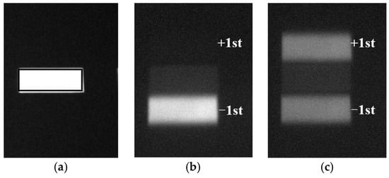 Furthermore, we also detected the linear polarization of the broadband image scene, and the experimental device is illustrated in Figure 7. Firstly, the object (Figure 8a) was placed in front of the detection device, and we adjusted the fast axis of the polarizer to −45°. Hence, the polarization information of the image was modulated to a uniform −45° linear polarization state. Then, we changed the QWP to 0° (Figure 8b) and 45° (Figure 8c), respectively, and took pictures with a camera (acA 1600-60gm, Basler Arensberg, Germany). After being diffracted by the LCPG, the incidence was divided into +1st- and −1st-order images (Ignore 0th). Using the principle, the intensity of the diffracted beam was all concentrated in the −1st order when the QWP was 0°, while the emitted +1st and −1st order diffraction efficiency was the same for the QWP at 45°. In addition, the number of pixels occupied by the 0-order image, shown in Figure 8b, was 37 rows × 94 columns, and the −1-order diffraction image was 43 rows × 94 columns. The inconsistency in the number of rows is caused by grating dispersion, and the smaller the grating period, the more pronounced the dispersion, and the more unfavorable it is for polarization solving. In imaging detection, it is necessary to ensure that the distance between the target and the QWP (object distance) is large enough to realize the separation of all the levels of diffraction images, which will not affect the compactness between the QWP and the camera in the system.