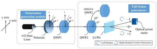 To verify the full Stokes polarization detection method, a full Stokes parameter detection setup was built by taking a laser beam as the light source, as shown in Figure 10. The 632.8 nm laser, polarizer, and QWP1 constituted a polarization generation module. Specifically, the light transmission axis direction of the polarizer was horizontally fixed (i.e., β = 0), and the polarized light with different ellipticities was generated by rotating QWP1 as the incidence to be detected. Then, the diffracted beams modulated by QWP2 and the LCPG were received by the optical power meter, and the polarization state of the incident light wave was solved according to the light intensity.