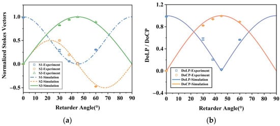 When the fast axis angle of QWP2 was 0°, 45°, and the QWP2 was removed, the light intensity data of ±1 orders were collected, respectively, and then the polarization state of the incident light was calculated. In addition, the results of the detected polarization state are shown in Figure 11a,b. The standard deviations in figures are marked by an error bar. The deviation between the experimental and theoretical values of the polarization characteristic parameters was small, indicating that the full Stokes polarization detection method designed in this paper can achieve full polarization detection.