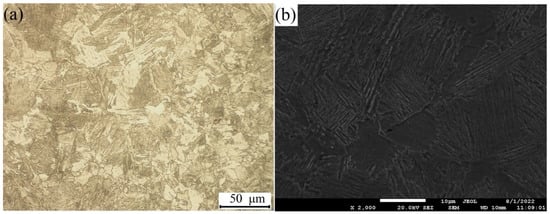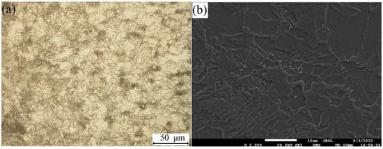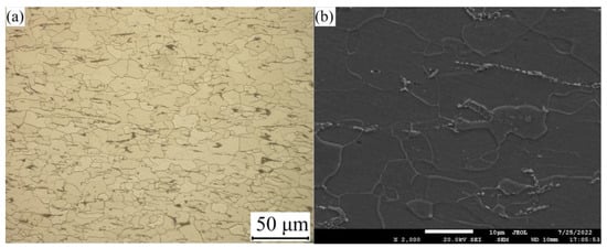 The microscopic photos of the BM obtained by the OM and SEM are described in Figure 2a,b. The BM is made up of ferrite gains and dispersed carbides. The length of the ferrite is about 15 µm.