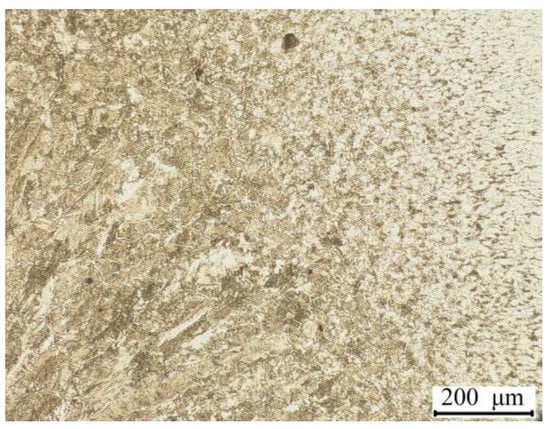 Although BH steel has a rather low carbon percentage, martensite is spotted in the CGHAZ. The transition into martensite is usually owing to the high cooling speed during the RSW process. The copper electrodes full of cooling water and short welding time are the roots for the rather high cooling rate. The cooling speed in the welding process can be roughly predicted by an established model. The cooling rate for the metal sheet with a thickness of 1.5 mm is around 4600 °C/s []. The critical cooling rate to produce the martensite can be computed by the following equation [].