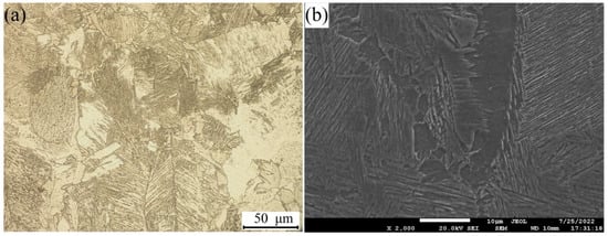 The microstructure of the CGHAZ: (a) OM; (b) SEM.