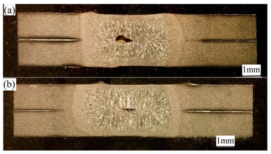 An alternating current resistance spot-welding machine was used for the welding experiments. Cu–Cr domed electrodes with a diameter of 5 mm were used. The bottom electrode was fixed and both electrodes were filled with cold water for the cooling stage of the spot-welding process. The water was 25 °C and its water flow was 4 L/min for cooling the electrodes [,,]. Before the welding experiments, the metal surface to be welded was cleaned with alcohol to remove the impurities.