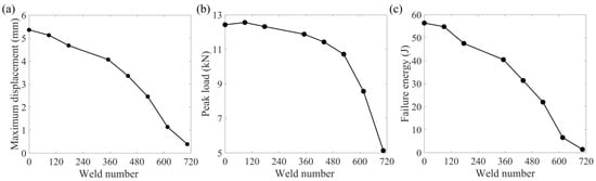 The mechanical attributes of the welded joints during the failure process of the electrodes. (a) maximum displacement; (b) peak load; (c) failure energy.