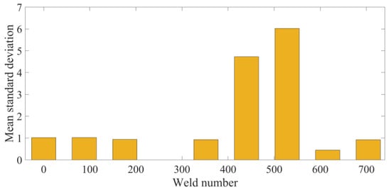 Figure 12 shows the average standard deviation of the peak load, maximum displacement, and failure energy of the welded joints as the number of welding repetitions increases. As the number of welds increases from 1 to 352, the mean standard deviation remains stable at around 1. It suddenly rises to 4.73 and continues to increase until it reaches a peak of 6.02. The accordance weld number is 528. However, as the welding operation continues, the mean standard deviation drops again, and its final value is 0.92, which is comparable to its initial value. In fact, the failure mode of all the weld joints in the range from 1st to 352nd is PF, while it is IF after the 616th weld. However, for the welds in the range of the 352nd and 616th weld, the failure mode is in the transition from PF to IF. At this stage, some welds undergo IF mode while others undergo PF mode. The percentage of welded joints experiencing PF decreases with repetition of the welding operation, while the fraction of welds with IF mode increases until all welds fail in IF mode.