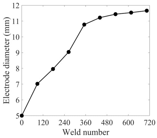 Continuous welding is usually performed in a real production line. The electrodes repeatedly heat and press the welded metal plates. In this case, they are prone to deterioration, especially when the coated metal sheets are welded []. It is discovered that the deterioration of the electrode has an unfavourable effect on the welding quality of the welded joint when the coated or uncoated metal sheets are continuously welded []. The standard for electrode life assessment is the number of welds that can be performed repeatedly until the critical acceptable nugget size is impossible to achieve []. Electrode life is an important limiting factor to improve welding efficiency on the welding production line []. Electrodes have a short life and require frequent trimming and replacement, resulting in reduced productivity and increased costs. In addition, at the end of the electrode life, the welding quality changes more significantly, especially when welding coated metals. Electrode deterioration leads to an increase in electrode diameter, which has a considerable effect on the welding quality [].