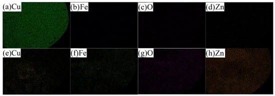 Through the analysis of element distribution, it is confirmed that, due to the reaction among the Cu electrode, Zn alloy coating, and the BM, there are various alloy layers with certain Fe–Zn–Cu phases on the electrode surface. The outer layer consists of ZnO and α-Fe(Zn) phases, the inner layer consists of the β-CuZn phase, and the middle layer consists of the Γ-ZnFe or γ-CuZn phase []. During the continuous welding process, the galvanized layer of the interface between the electrode and the steel sheet melts due to the high temperature. When the copper electrode is exposed to molten zinc–iron, different copper-zinc–iron alloy layers are formed according to different levels of temperature and durations []. In addition, during continuous welding, zinc diffuses from the outer layer of the electrode surface to the inner layer, forming β-CuZn, γ-CuZn, and α-CuZn phases []. The thickness of the alloy is 11 μm for the electrode for the 176th weld, its thickness is 17 μm for the 352nd weld, and its value is 24 μm for the 704th weld. Finally, during the continuous welding process, the surface of the Cu electrode is transformed into an alloy layer composed of various Cu–Zn–Fe phases, as illustrated in Figure 15.