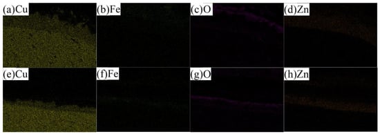 EDS measurements of the elements on the electrode cross-section: (a–d) the 176th weld; (e–h) the 704th weld.