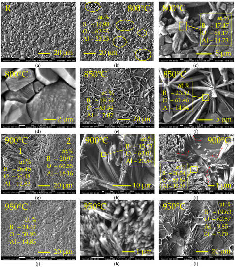 SEM micrographs of the reference Al2O3 sample surface (a) and surfaces of Al2O3 samples after boronizing at 800 °C (b–d), 850 °C (e,f), 900 °C (g–i) and 950 °C (j–l) temperatures; (b) yellow ovals show points of the appearance of aluminium borate crystals on surface; in images, the concentration of major elements is given (the remaining are Ca, Mg, Si); R—reference sample.