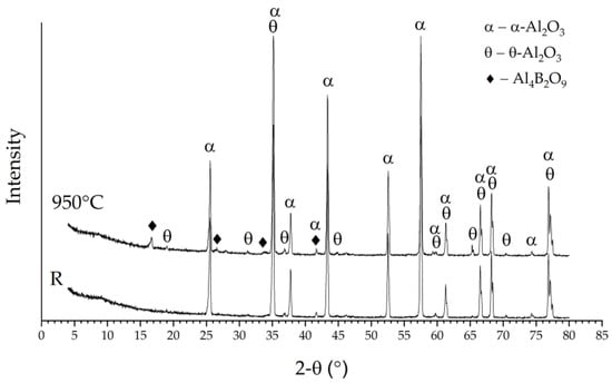 According to the results of the X-ray diffraction analysis, the control samples consisted mainly of α-Al2O3; the minor reflections attributable to θ-Al2O3 were identified in the diffraction curve as well (Figure 2, “R”). The results of the SEM and EDS analyses allowed us to assume the formation of aluminium borates—compounds typical for the Al2O3–B2O3 system. Gielisse and Foster [] obtained two stable borates in this binary system—Al4B2O9 and Al18B4O33. Hernández et al. [] indicated that Al4B2O9 and Al18B4O33 formation from alumina and boron oxide occurs between 600 and 800 °C. Since the temperature of boronizing was between 800 and 950 °C, either could be obtained in the present experiments. The surface on the samples boronized at 800 °C and 850 °C contained very few crystals for the new phase. Therefore, the X-ray diffraction signal from these surfaces was too low. The layer thickness of the new crystals formed after boronizing at 900 °C and 950 °C was between one and a few micrometres, which is much lower than the depth of X-ray diffraction analysis. Therefore, major reflections attributable to α-Al2O3 and θ-Al2O3 were observed on the diffraction curves of boronized samples, the same as the reference. In addition, the XRD patterns of boronized samples revealed the presence of reflections at 2-Theta angle ~16.5°, ~26.4° and ~33.3° (Figure 2, “950 °C”), which may be assigned either to Al4B2O9 or Al18B4O33. However, the absence of any evidence of peak formation at 2-Theta angle ~20.4° (typical for Al18B4O33) indicates that aluminium borate of the Al4B2O9 type rather than Al18B4O33 may be assumed in this case.