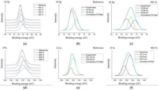 Figure 3 shows the Al2p, O1s and B1s peaks obtained by X-ray photoelectron spectroscopy for the reference sample and samples boronized at different temperatures. Figure 3a reveals an Al2p peak centred at ~74.8 eV for the reference sample. The position of the Al2p peak for the sample boronized at 800 °C did not differ visibly from that of the reference, while with further temperature increases, a slight peak position shift to the higher binding energies was observed. For the reference sample, two peaks with binding energies of ~74.5 eV and 75.4 eV were deconvoluted (Figure 3b), which, according to various sources [,], are typically attributed to Al2O3 and surface-bound hydroxyl groups on Al (Al–OH). For boronized surfaces, the appearance of one more peak component was observed at a higher binding energy (~76.65 eV), which was most expressed for samples boronized at higher temperatures containing more boron and showing plenty crystallization of aluminium borate crystals (Figure 3c). In borates, boron and oxygen atoms form planar trigonal BO3 units or negatively charged tetrahedral [BO4]– units based on strong covalent boron–oxygen bonds []. Respectively, the appearance of this peak might be attributed to borate units bound to aluminium (Al–O–B).