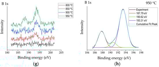 In their study, Ogugua et al. [] investigated an iron-doped ZnAl2O4 system and determined Al2p peak’s shift to higher binding energies with the increase of iron concentration. The authors assigned the appearance of Al2p peak components at 76.0 eV and 76.1 eV to Al–O–Fe. The authors related the appearance of the peak assigned to Al–O–Fe at a higher binding energy than that of peaks assigned to Al–O and Al–OH with higher electronegativity of Fe (1.83) than Al (1.61). Taking into account that the electronegativity of boron is even higher (2.0), the appearance of the Al–O–B peak component at higher binding energies looks to be reasonable. O1s peaks of boronized surfaces were also shifted to higher binding energies as compared with the reference (Figure 3d). For the non-modified Al2O3 surface, two peaks’ components were observed after deconvolution (Figure 3e)—the peak at ~531.2 eV ascribed to O in Al2O3 and the peak at ~532.0 eV typically assigned to OH−, chemisorbed oxygen or dissociated oxygen []. For boronized samples, one more peak at higher binding energy ~533.1 eV appeared (Figure 3f), which, according to [], may be attributed to O–B bonds. The results of the analysis of B1s peaks were consistent with the studies presented above and confirmed them in general. All B1s spectra obtained have shown peaks centred at ~193.3 eV (Figure 3g), attributable to B–O []. For more intensive spectra obtained at surfaces boronized at 900–950 °C, a peak centred at ~187.8 eV was observed, as well as a minor peak at ~190.6 eV (Figure 3h), which, based on the results reported earlier [], may be assigned to B–O–Al bonds. The peak at 187.8 eV here should most likely be attributed to elemental boron from amorphous boron residues on the surface.