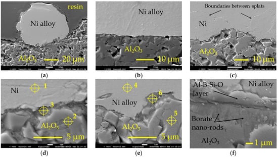 SEM micrographs of the thermally sprayed samples’ cross sections: (a,b)—single splat and layer, respectively, of the self-fluxing Ni-based alloy on the surface of Al2O3 boronized at 950 °C (after thermal spraying and post-heating at 1200 °C for 180 s); (c)—thermally sprayed layer of the pure nickel on the surface of Al2O3 boronized at 950 °C; (d,e)—interface between the pure nickel and Ni-based alloy, respectively, deposit and ceramic substrate with marked points of EDS analysis; (f)—intermediate layer between Ni-based alloy deposit and borate layer; Ni—pure nickel; Ni alloy—self-fluxing re-fusible Ni-based NiCrFeCBSi alloy; 1–6—points of EDS analysis.
