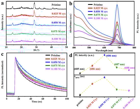 Figure 1a is the XRD patterns of the pristine CQDs and the Cys-processed CQDs. The peaks were around 14° and 28°, which is in good agreement with the (100) and (200) planes of the CsPbI3 cubic phase []. This indicates that the processing of the CQDs surface by Cys did not destroy the crystal structure of the CQDs. To explore the effect of post-processing on the optical properties of the CQDs, we carried out UV-vis as well as PL spectra. Figure 1b shows the UV-vis and the PL of the pristine and Cys-processed CQDs. The absorption and emission peaks of pristine CQDs are located at 680 and 685 nm, which are identified as belonging to CQDs [,]. After Cys post-processing, the PL of the CQDs shows a slight redshift to 686–688 nm with different concentrations of Cys, which are marked in Figure 1d. Moreover, as shown in Figure 1b, both the pristine and cys-processed CQDs show narrow PL curves, and the Cys-processed CQDs exhibit a narrower average full-width at half-maximum (FWHM) of 32 nm compared to the 36 nm FWHM of the pristine counterparts. This indicates that the size of CQDs is more homogeneous after Cys post-processing. Meanwhile, the PL intensity of the CQDs gradually varies with the concentration of Cys, and when the concentration of Cys reached 0.05 M, the PL intensity achieved the maximum (Figure 1d). Furthermore, TRPL decay tests were conducted, as shown in Figure 1c. These CQDs have an obvious biexponential decay characteristic, and the fitted parameters of PL decay curves and average lifetime (τave) are summarized in Table 1. As shown in Figure 1d, the τave of CQDs shows the same pattern as PL intensity with increasing Cys concentration. The CQDs with 0.05 M Cys processing have the longest τave of 45.17 ns, which is higher than that of 31.45 ns for the pristine CQDs. These are attributed to the fact that low levels of Cys effectively suppress the surface defects of the CQDs, while, as Cys increases, the excess Cys remaining in solution provides the nucleation sites that drive the aggregation of CQDs, which leads to the aggregation and sedimentation of the active ingredients in the colloidal solution [,]. Meanwhile, the coordination of Cys on the surface of the CQDs changes from tridentate to bidentate as its concentration increases from low to high, which weakens the defect suppression effect [].