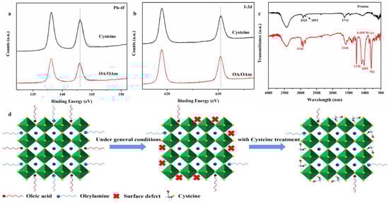 To further demonstrate that the Cys combines strongly with the perovskites, we performed the XPS of pristine and Cys-processed CQDs. As shown in Figure 3a for Pb 4f, the pristine QDs have a lower binding energy of 138.05 eV and 142.91 eV compared with that of 138.23 eV and 143.11 eV for Cys-processed QDs, suggesting that the lead ions combine with Cys for their high binding force. Figure 3b shows similar offsets in I 3d, and the peaks in the I 3d spectrum that corresponded to the 3d5/2 and 3d3/2 oxidation states of I shifted from 618.95 to 618.98 eV and 630.43 to 630.52 Ev, respectively, indicating the adjustment in the chemical bonding between Pb2+ and I− owing to the incorporation of Cys. Figure 3c is the FTIR spectra of the pristine and the Cys-processed CQDs. For the pristine CQDs capped with OA and OAm, the peaks at 2850–2930 cm−1 originate from the stretching mode (ν(C-H)) of alkane in the OA and OAm ligands. The peak at 1711 cm−1 is the characteristic peak from OA (νas(coo-)). After ligand exchange with cysteine, the peaks of Cysteine ligands showed up (3166, 1646, 1270, 1055, and 753 cm−1). These results proved that the Cys, as a new ligand, combined with the surface of the perovskites and had stronger coordination interaction between Pb2+ and Cys []; the post-processing of CQDs surface defects by Cys is illustrated in Figure 3d. Diverse functional groups of Cys effectively suppress uncoordinated lead as well as iodine on the surface of CQDs.