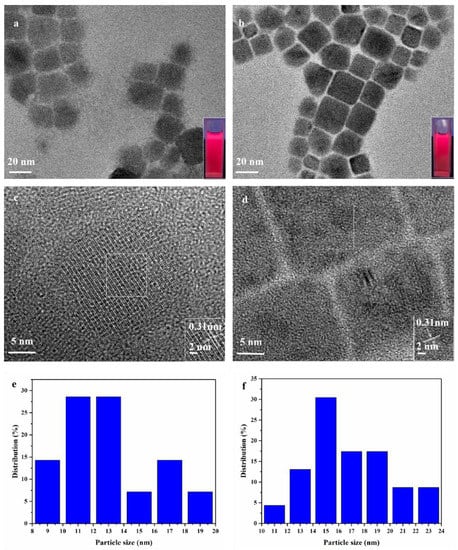 The transmission electron microscope (TEM) was used to investigate the morphology of the QDs and observe the close-packed particle arrangement after the ligand exchange procedures. As is shown in Figure 4a,b, both the as-synthesized QDs have an obvious cubic morphology in non-polar solvents, which suggests that the lattice remains unchanged after the ligand exchange. The average particle sizes of the pristine CQDs and the Cys-processed samples are 14 and 16 nm, respectively; the corresponding size distributions are shown in Figure 4e,f. Figure 4c,d show high-resolution TEM (HR-TEM) images of single CQDs from Figure 4a,b, respectively. The well-resolved lattices indicate that the CQDs are single-crystalline CQDs. The interplanar distance of both samples is 0.31 nm, corresponding to the (100) plane of α-CQDs. The post-processing of CQDs by Cys did not affect the crystallization process of the CQDs and it remained in the cubic phase, which was consistent with the XRD, and Cys did not enter the interior of the CQDs and only acted on the surface of it.