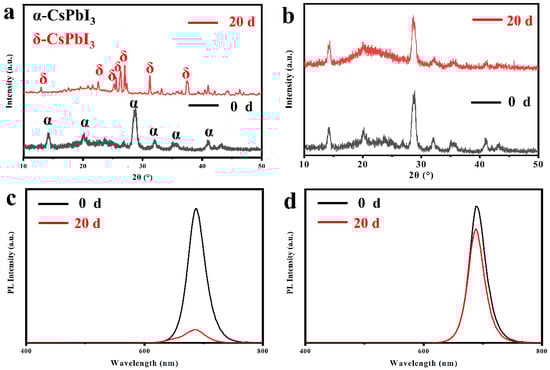 Time-dependent XRD and the PL intensity of CQDs were used to evaluate the stability of CQDs. By comparing the phase stability of the pristine and Cys-processed CQDs in an atmosphere with an average temperature of 30 °C and an average humidity of 85%, it was found that the black α phase of pristine CQDs was almost completely converted to the optically inactive δ phase after 20 days (Figure 5a) []. At this point, the Cys-processed CQDs still retained the black α phase (Figure 5b). Synchronously, we measured the PL spectra of the pristine and the Cys-processed CQDs after storage under an identical atmospheric environment for a while. As is shown in Figure 5c,d, it is obvious that the Cys-processed CQDs retained more than 86% of the initial PL intensity after 20 days of storage, while the PL intensity of the original CQDs at the same conditions decreased almost to quenching. This is due to the small molecule of Cys accompanied by a small spatial site resistance. It is more effective in post-processing through the close contact of multifunctional functional groups with the surface of CQDs while isolating water and oxygen from the atmosphere, greatly improving the stability of the CQDs [,].