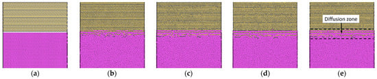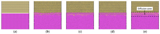 The diffusion characteristics of the SiC/Al interface are studied by heating the system to a pre-set temperature and maintaining it for 6.0 ns at this temperature. Figure 2 shows the evolution of the interface diffusion for different snapshots with 2.0 ns intervals for the C-terminated 6H–SiC/Al interface and heating up to 2000 K. Figure 2a shows the sharp interface between SiC and Al considering an initial gap equal to the C-Al bond length. It can be seen from Figure 2b that before the temperature reaches 2000 K, the Al atoms move locally near the interface because of the strong interfacial bond between Al and SiC. Hoekstra and Kohyama [35], using the ab initio pseudopotential method, showed that the C–Al bond is almost twice as strong as the Si–Al bond, and in general, the interfacial bond between the SiC and Al is stronger than the intralayer bonds within the pure aluminium. By maintaining the system at 2000 K, more atoms pass through the interface, and a thicker fuzzy interface is produced. The diffusion zone after maintaining the system at 2000 K for 6.0 ns is illustrated in Figure 2e.