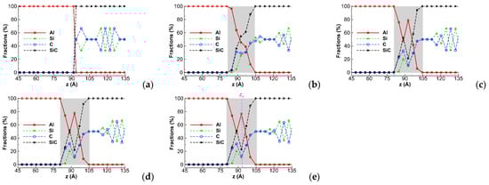Concentration profiles of Al, Si, and C atoms along the z-direction during interdiffusion of the C-terminated 3C–SiC/Al interface. The grey zone in the figures indicates the diffusion zone and its thickness. (a) Atomic structure at 300 K before relaxation and the configuration after maintaining the system at 2000 K for (b) 0 ns, (c) 2 ns, (d) 4 ns, and (e) 6 ns.
