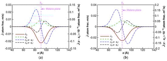 Figure 9 shows, for example, the profiles of the interdiffusion flux and for the C-terminated 6H–SiC/Al and 3C–SiC/Al diffusion couples after maintaining the systems at 2000 K for 6 ns. The Matano plane is marked as z0 in Figure 4e, Figure 5e and Figure 9 based on Equation (9). In the analysis, the Al and Si atoms are chosen as independent variables, and the C atom is selected as the dependent variable. It can be seen that the absolute of corresponds to a relative maximum of the interdiffusion flux at the Matano plane. Moreover, similar variations of the profiles are seen to exist for the two diffusion couples. It is seen that Al atoms exhibit greater interdiffusion fluxes than Si atoms in both diffusion systems, as predicted. The interdiffusion flux for dependent component 3 (here the C atoms) can be evaluated from the equation . Hence, it is simple to demonstrate that for both diffusion systems, the interdiffusion fluxes of C atoms are higher than those of Si atoms, but lower than those of Al atoms. Furthermore, the maxima of the interdiffusion fluxes of Al and Si in 6H–SiC/Al are about 13% and 17% smaller, respectively, than those of 3C–SiC/Al.