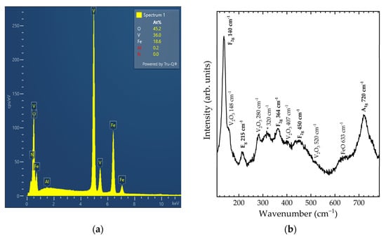 (a) EDXS analysis results and (b) Raman spectrum of the as-synthesised sample. Modes related to spinel FeV2O4 are labelled in bold.