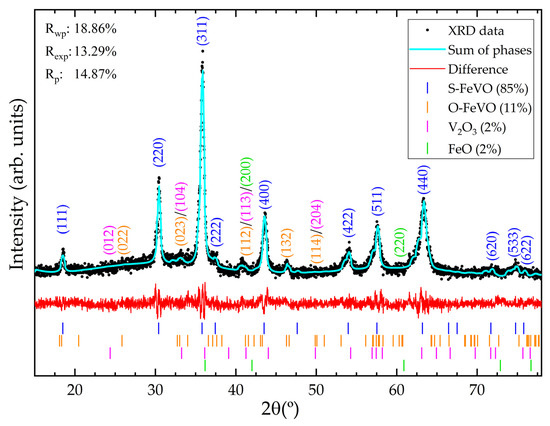 Multi-phase Rietveld refinement at ambient conditions of S-FeVO including the additional minor phases. Black dots are the measured pattern. The solid cyan line is the overall calculated Rietveld profile. The difference between the observed and calculated data is shown with a red line. Tick marks indicate the calculated Bragg peak positions. Relevant reflections are labelled with their corresponding Miller indices.