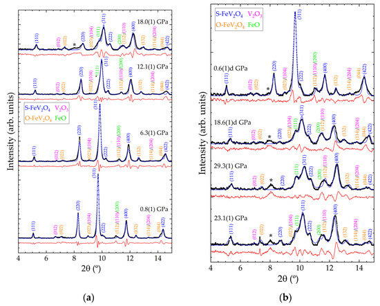 One possible explanation for the appearance of the peak marked as *(111) in Figure 3a and the broadening of peaks of cubic FeV2O4 could be related to a structural phase transition. The changes in the patterns are typical of phase transitions involving a symmetry decrease. We tested possible HP structures by applying group-subgroup relationships to spinel FeV2O4. We have tested the tetragonal post-spinel structure proposed by Yong et al. [47]. However, following this method we could not successfully explain the changes observed in the XRD patterns because the candidate HP structures all exhibited unit volumes larger than that of the low-pressure phase, which cannot be possible. We have also tested the known high-pressure post-spinel phases (CaFe2O4-, CaMn2O4-, and CaTi2O4-type [48]) and found that these post-spinel structures also could not explain the changes observed in the XRD patterns. We did not consider cation inversion between Fe and V, because these elements have a similar atomic number, which does not allow us to determine the amount of element substitution from the present experiments. However, we are fully aware that cation substitution could influence the phase stability and bulk modulus [49]. A second-possible explanation for changes in XRD is pressure-induced decomposition, which is known to occur at pressures below 10 GPa in vanadates [50,51]. In our case, the reflection which appears at 12 GPa can be interpreted as an indication of pressure-induced chemical decomposition of the sample because the reflection corresponds to the (111) reflection of FeO. The reflections assigned to V2O3 also become more intense with increasing pressure. In the ambient pressure XRD data shown in Figure 2, the Rietveld refinement suggests that the V2O3 and FeO each constitute around 2% of the total sample. Therefore, by comparison with the intensity of their most recognizable reflections ((012) for V2O3 and (111) for FeO) with the highest one of S-FeVO, (311), it is possible to quantify the decomposition. The amounts of V2O3 and FeO in the sample gradually increase with compression up to 14% each, whereas S-FeVO reduces to 61%. Upon decompression, the decomposition products partially recombine into the original state, ultimately constituting only around 8% of the sample at 0.6(1)d GPa. The O-FeVO contribution remains constant throughout the experiment, indicating that it does not chemically decompose or transition to another phase in the studied pressure range. The phenomenon of reversal of the pressure-induced chemical decomposition has previously been observed in other systems, including vanadates [51,52].