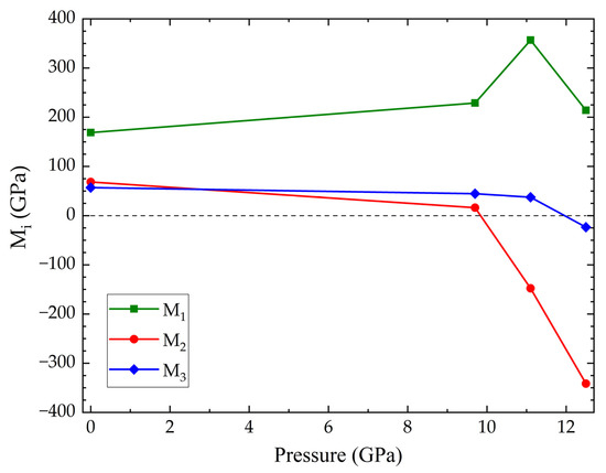 Figure 3 shows integrated polycrystalline XRD data acquired on compression and decompression for S-FeVO and the corresponding Rietveld profiles. Measurements were performed on various sample locations to prevent the appearance of Cu reflections in these patterns. All minor phases are observed up to the maximum pressure of 29.3(1) GPa and on recovery to ambient conditions. The highest intensity reflection in the data shown in Figure 3 originates from the (311) reflection in the S-FeVO structure. This reflection starts to develop a left shoulder contribution at 12.1(1) GPa (see the reflection marked *(111) in Figure 3a). As pressure further increases, this shoulder contribution gradually gains intensity when compared to the rest of the pattern. This phenomenon observed in the experimental data is consistent with the DFT calculations, which find that the S-FeVO structure becomes mechanically unstable at 11.1 GPa. In addition, above 12 GPa, the calculations predict imaginary phonons and elastic constants (see Table 2). We found that at pressures larger or equal to 11.1 GPa the calculated elastic constants violate the generalised Born criteria of stability under pressure (P) (M1 = (C11 + 2C12)/3 + P/3 > 0, M2 = C44 − P > 0, M3 = (C11 − C12)/2 − P > 0) [44]. This can be seen in Figure 4 where we represent the Born criteria conditions Mi versus pressure. At 11.1 GPa, only M2 is violated. The failure through M2 < 0, called the Born instability, is characterized by symmetry breaking with a coupling of shear modes under volume conservation [45]. At 12.5 GPa, M3 is also violated, which implies a pure shear instability. In the same pressure range, M1 abruptly changes decreasing with pressure beyond 11.1 GPa. This behaviour implies a decrease of the bulk modulus when pressure increases, which means a decohesion of the crystal structure, supporting the notion that the crystal structure becomes destabilised at high pressures [45,46].