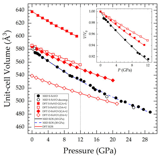 FeV2O4 unit-cell volume as a function of pressure. Black filled circles correspond to experimental S-FeVO on compression and open circles to S-FeVO on decompression data. Red squares represent DFT S-FeVO (filled for GGA+U and empty for LDA+U). Red diamonds represent DFT O-FeVO (with the displayed volume doubled in order to correspond to the same number of formula units). Lines correspond to third order Birch-Murnaghan EOS. Two EOS are fitted to the experimental S-FeVO data, one up to 10 GPa and one up to the maximum pressure. The vertical dashed line at 12 GPa corresponds to the critical pressure for the onset of pressure-induced chemical decomposition. The normalized volume for S-FeVO data is shown in the inset.