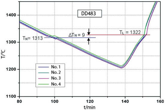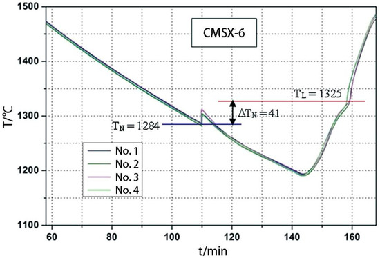 | Alloy | Liquidus Temperature TL (°C) | Nucleation Temperature TN (°C) | Nucleation Undercooling ΔTN = TL − TN (K) | Undercooling Capacity Level |