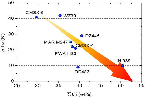 | Cr | Co | W | Mo | Al | Ti | Ta | Re | Hf | Total (∑Ci) | |